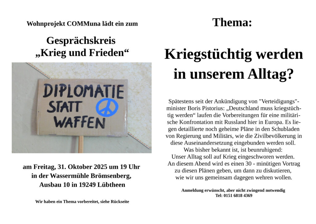 die COMMuna in der Wassermühle Brömsenberg lädt ein zum „Gesprächskreis Krieg & Frieden“